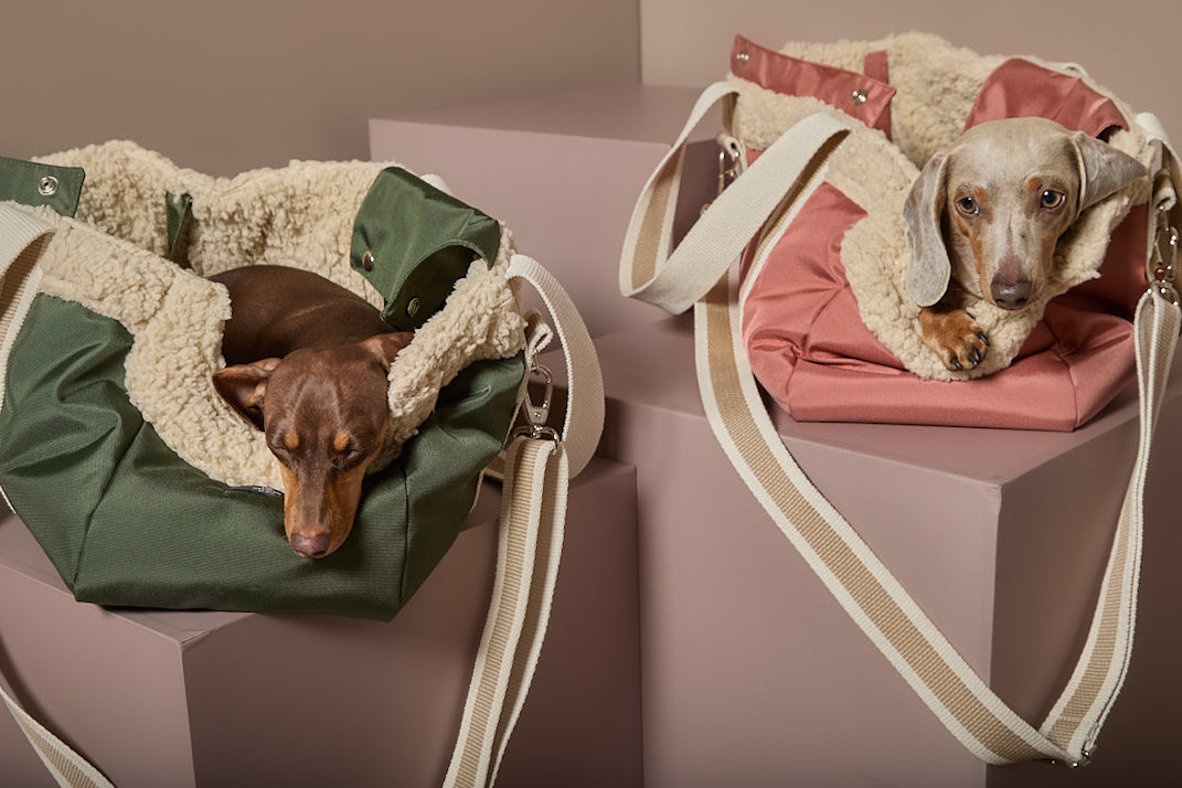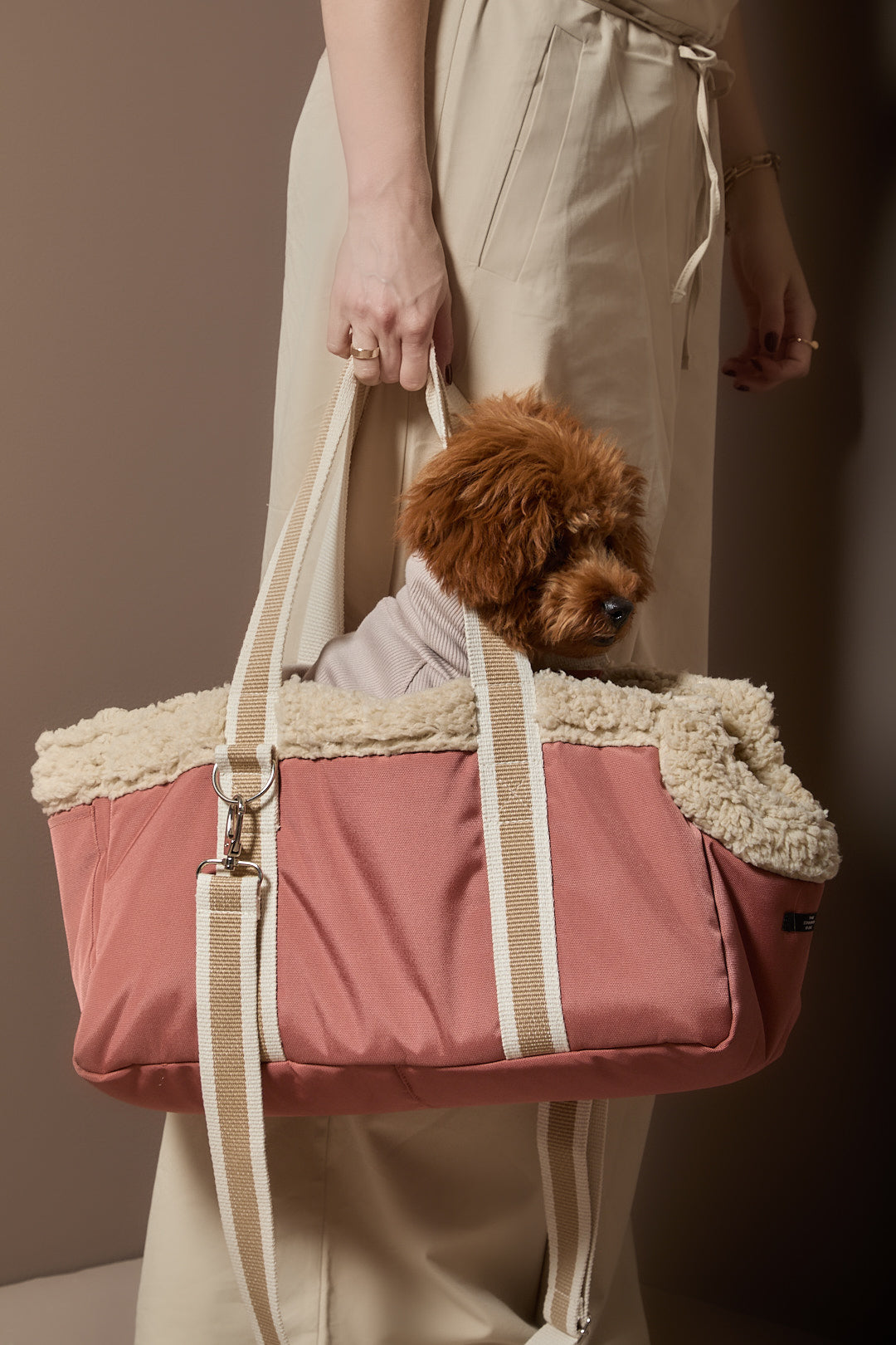 Bolso de mano con exterior en tela rosado impermeable e interior acolchado de peluche. Incluye correa interna para mantener seguro a tu perro, bolsillos prácticos para tus pertenencias y una correa larga ajustable para llevarlo cruzado con comodidad.