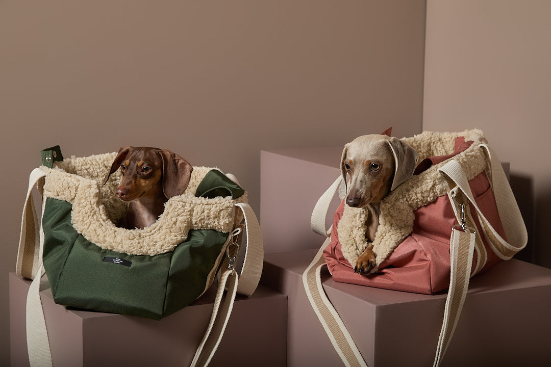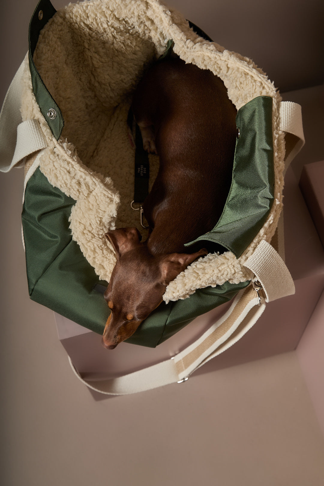 Bolso de mano con exterior en tela verde impermeable e interior acolchado de peluche. Incluye correa interna para mantener seguro a tu perro, bolsillos prácticos para tus pertenencias y una correa larga ajustable para llevarlo cruzado con comodidad.