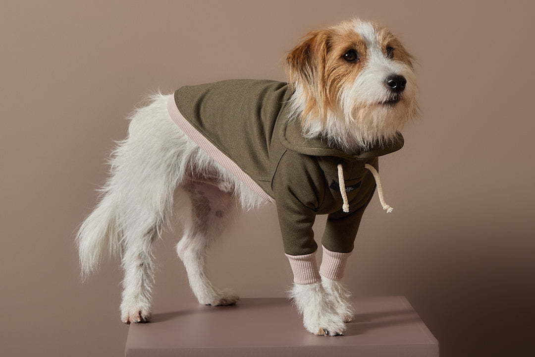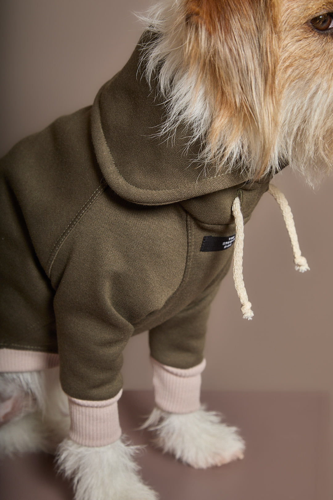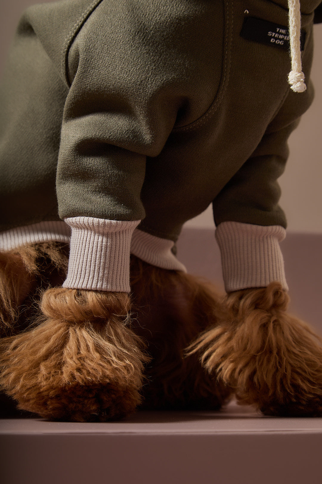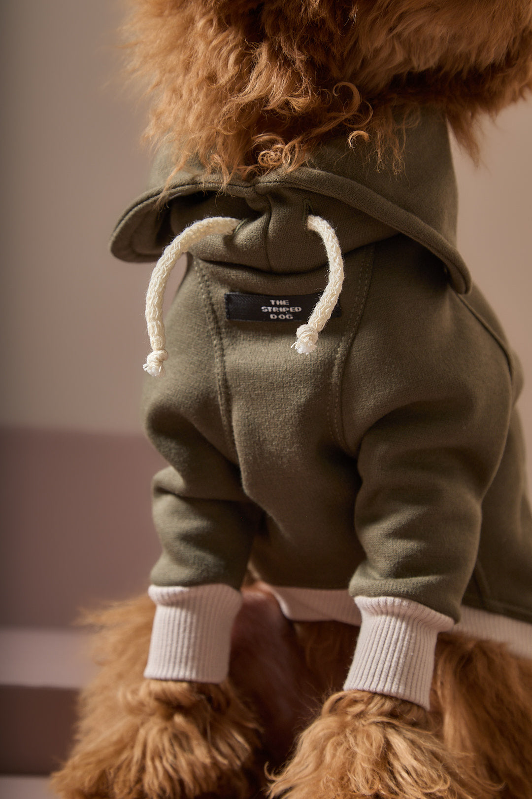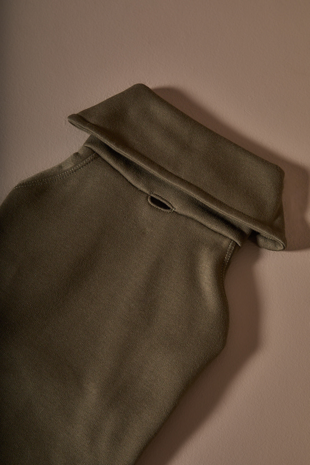 Buzo verde militar cuello tortuga con detalles en rib arena y cordón crudo.