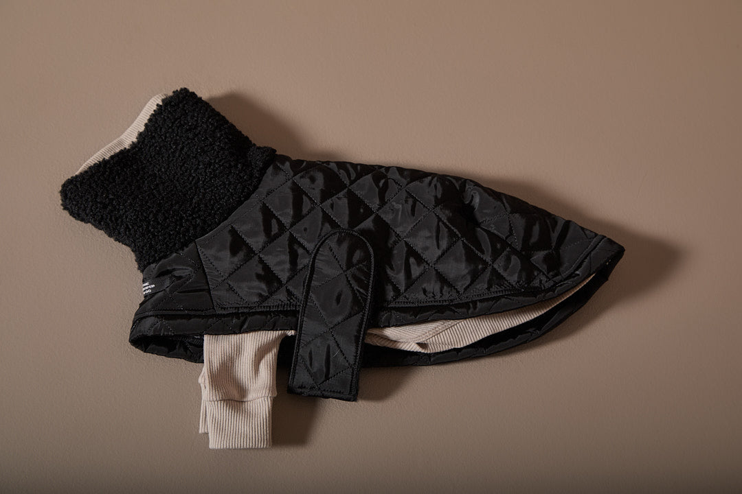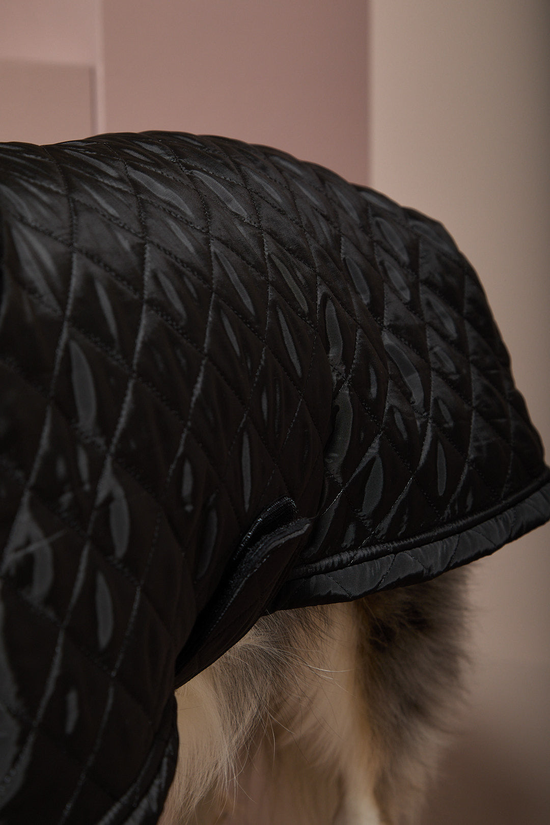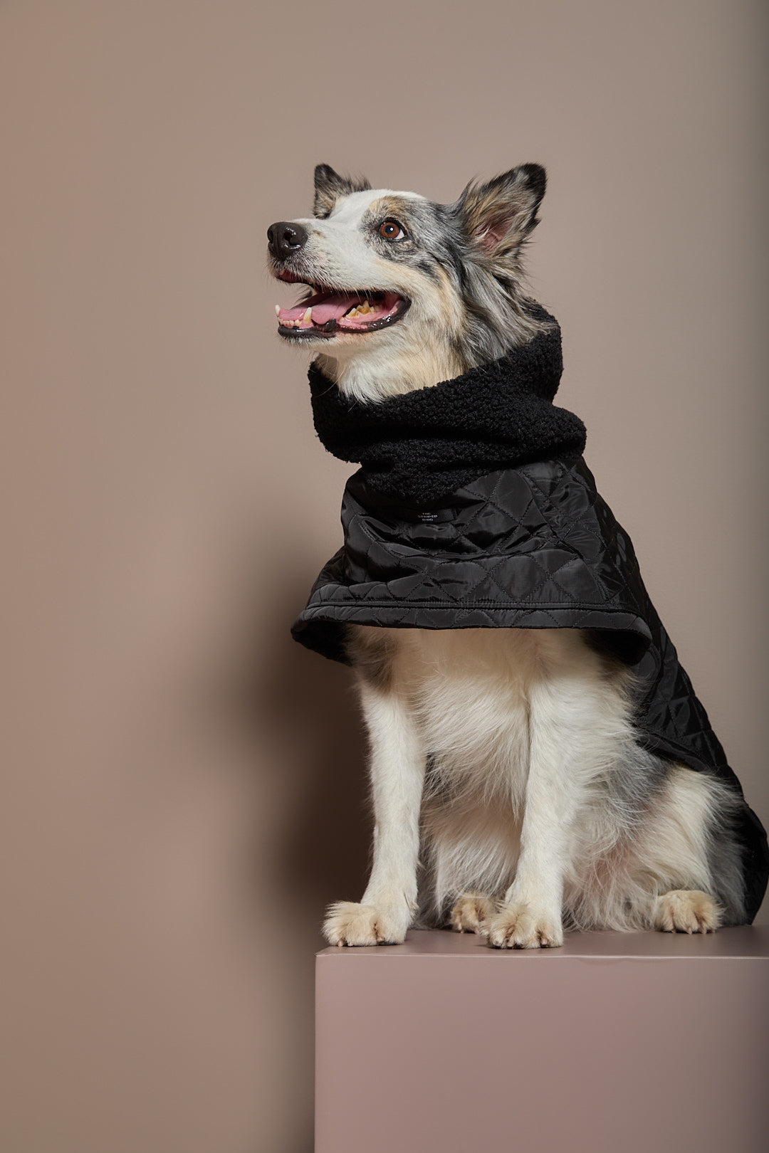Capa negra con cuello tortuga y forro interior de peluche. Ajustable en el pecho con cierre de velcro.
