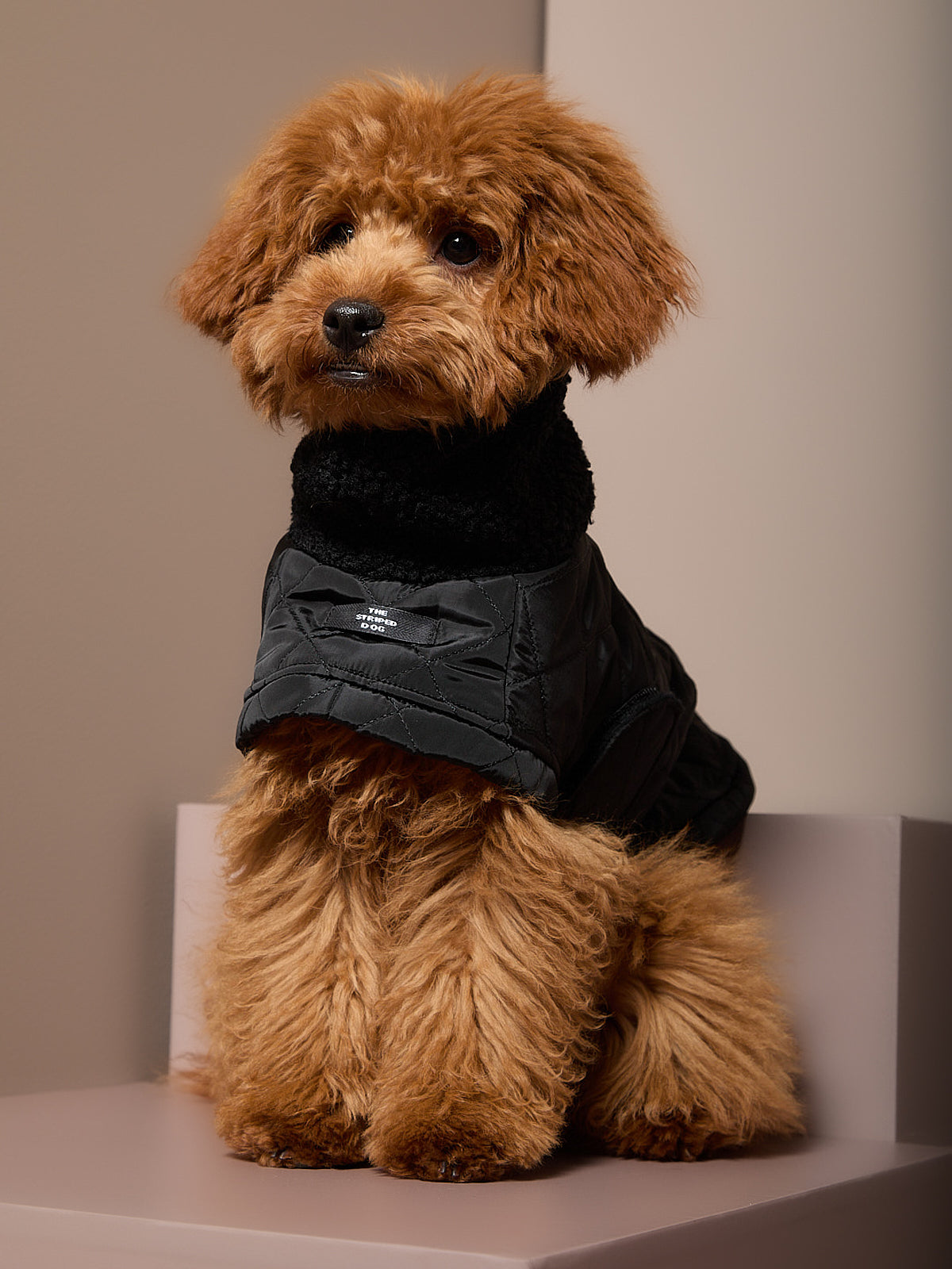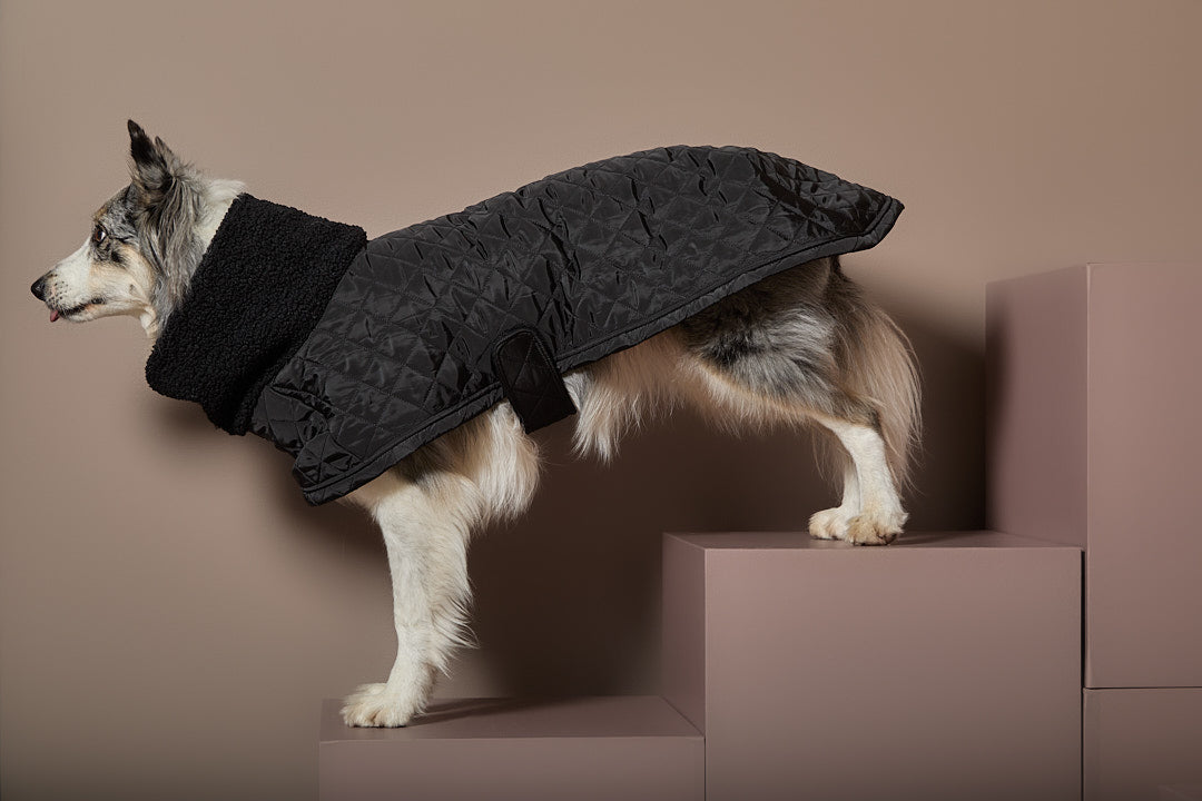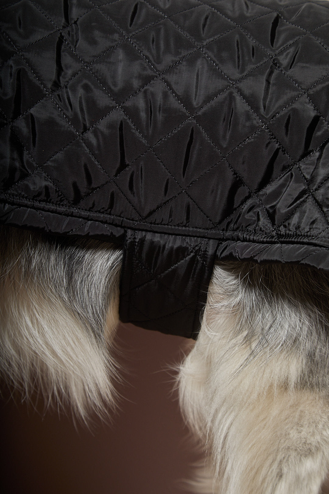 Capa negra con cuello tortuga y forro interior de peluche. Ajustable en el pecho con cierre de velcro.