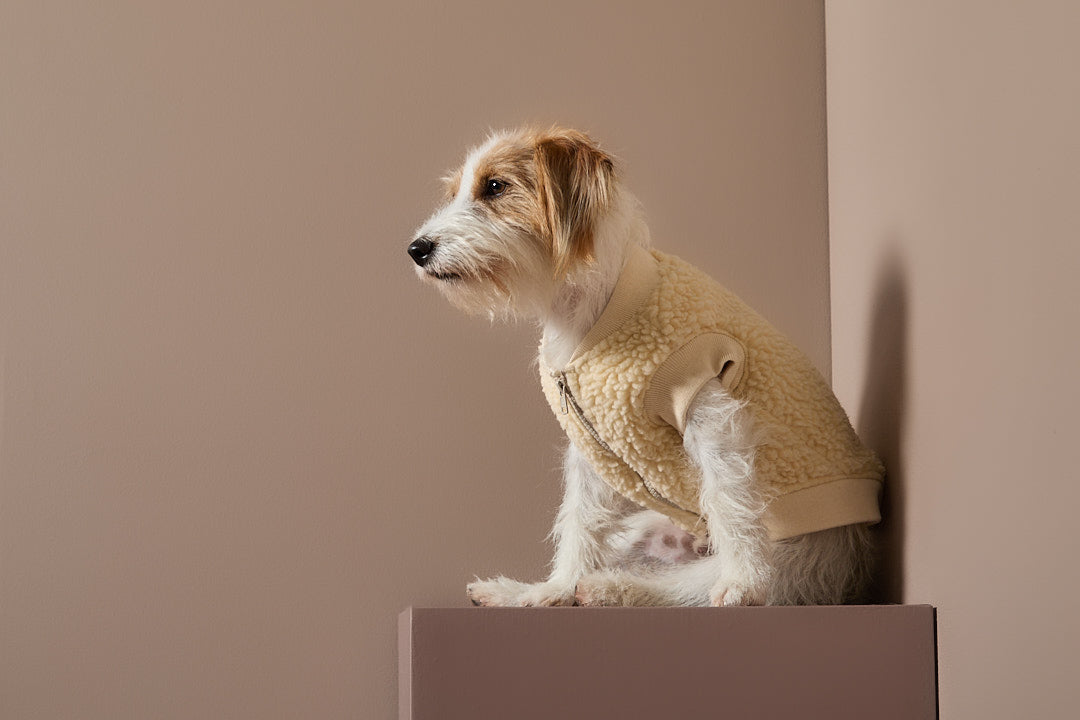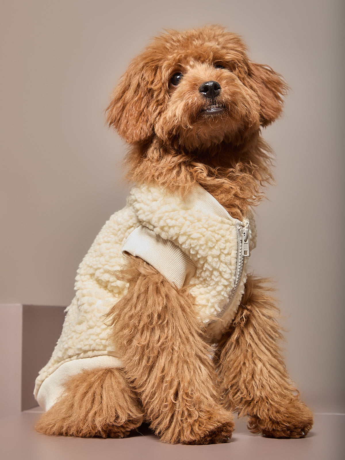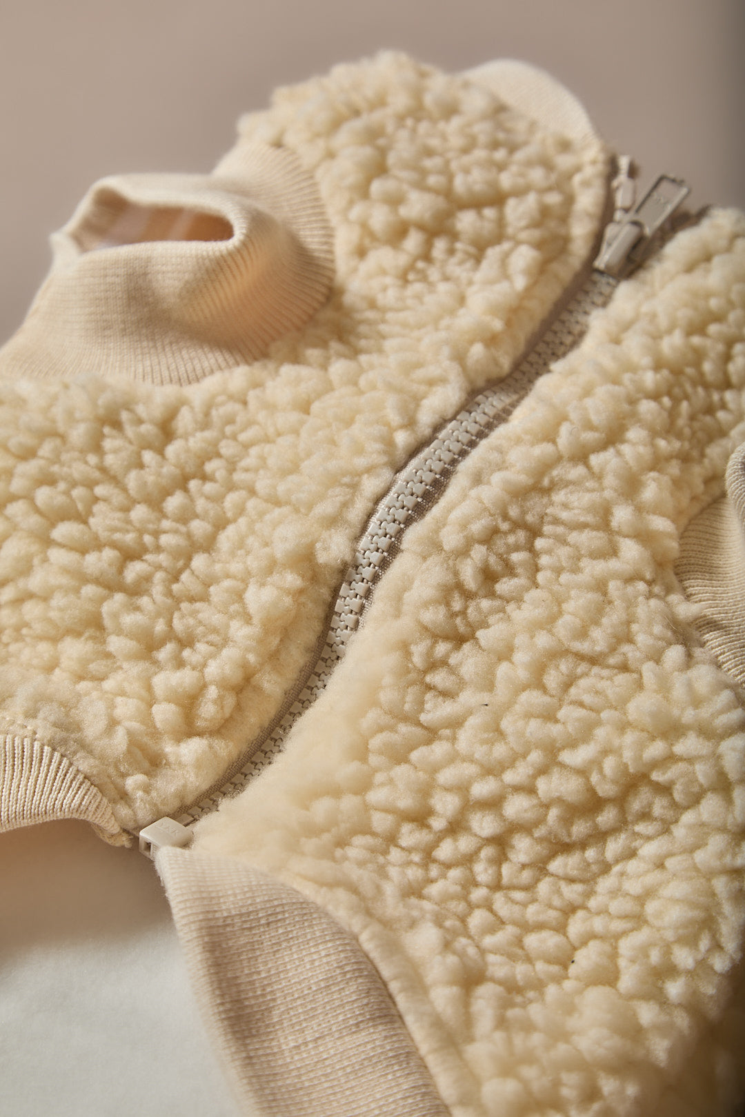 Chaleco en sherpa crema con cierre y detalles en rib.