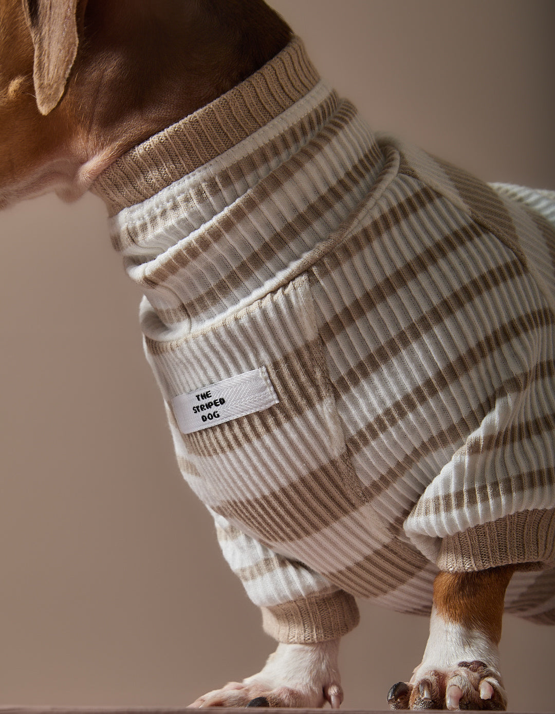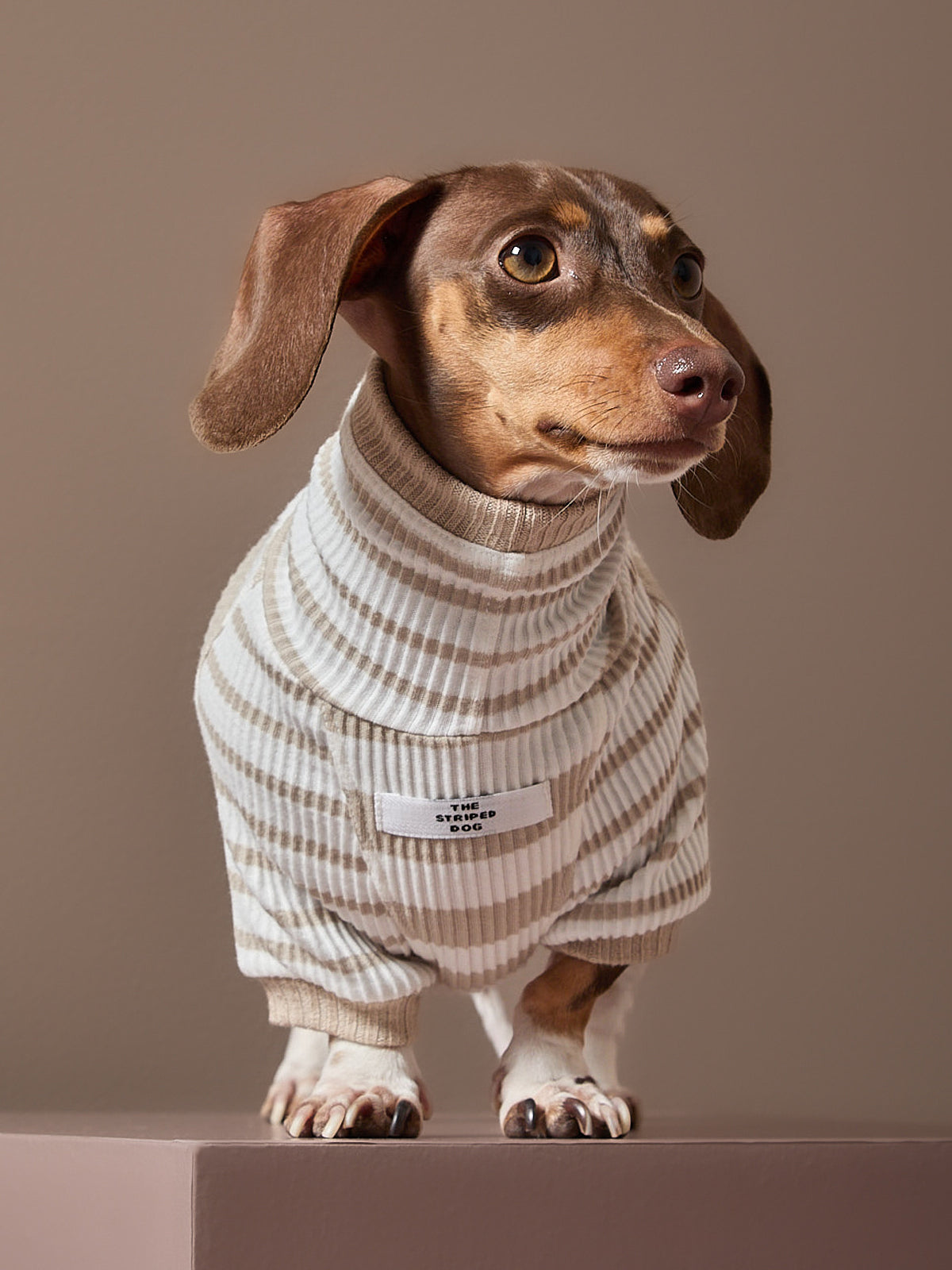 Suéter en rib de rayas arena y crema con cuello tortuga. Ligero, suave e ideal para climas frescos.